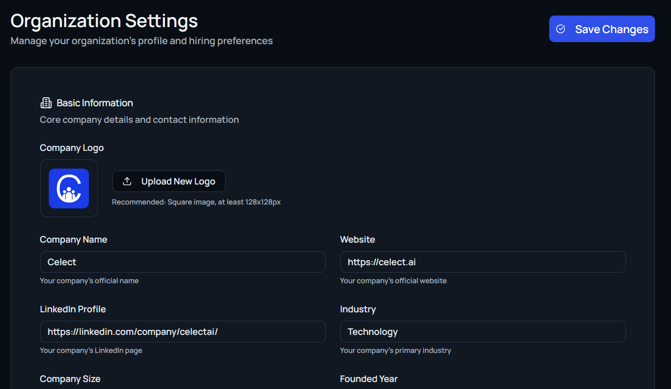 The Settings page stores organization-level information used across Celect. From brand identity to hiring goals, each section keeps your profile current so candidates and internal tooling stay aligned.