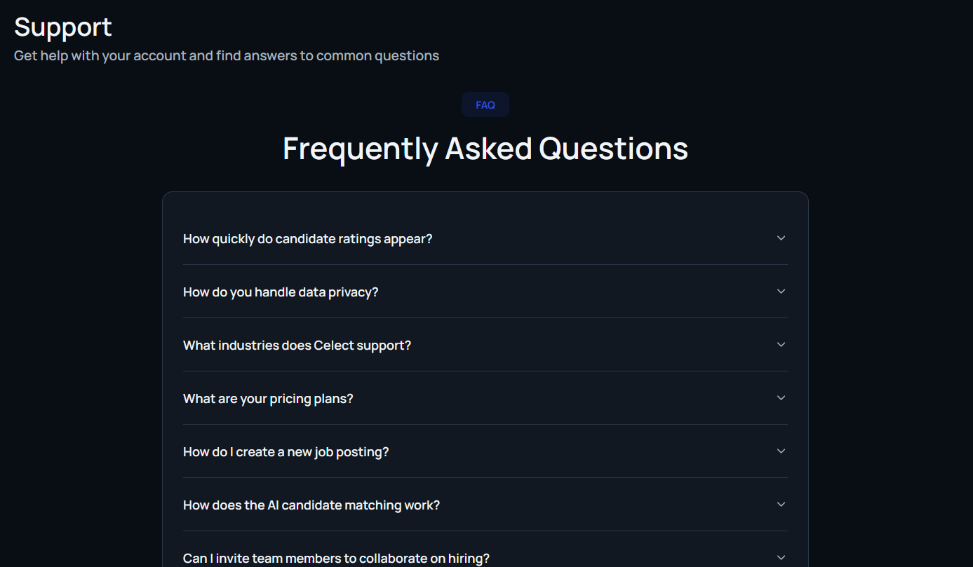 The Support page provides direct access to Celect’s help team and AI assistant. Use it whenever you encounter issues, need clarification, or want quick guidance.