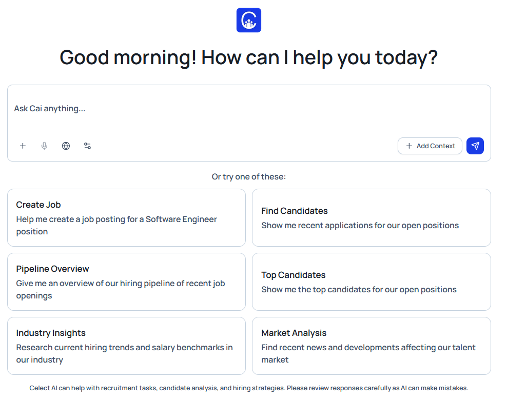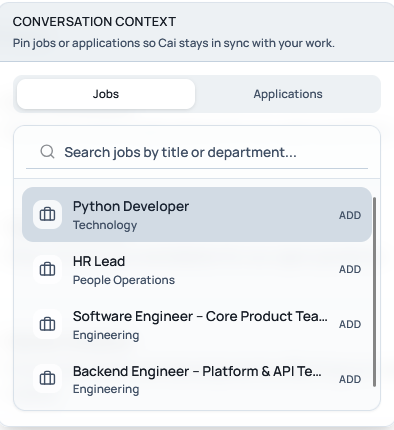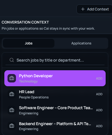 Cai tailors every action to the selected context, ensuring instructions remain job-aware and personalized. You can further refine Cai's work by adding context in the form of specific Jobs or Application via the Add Context button