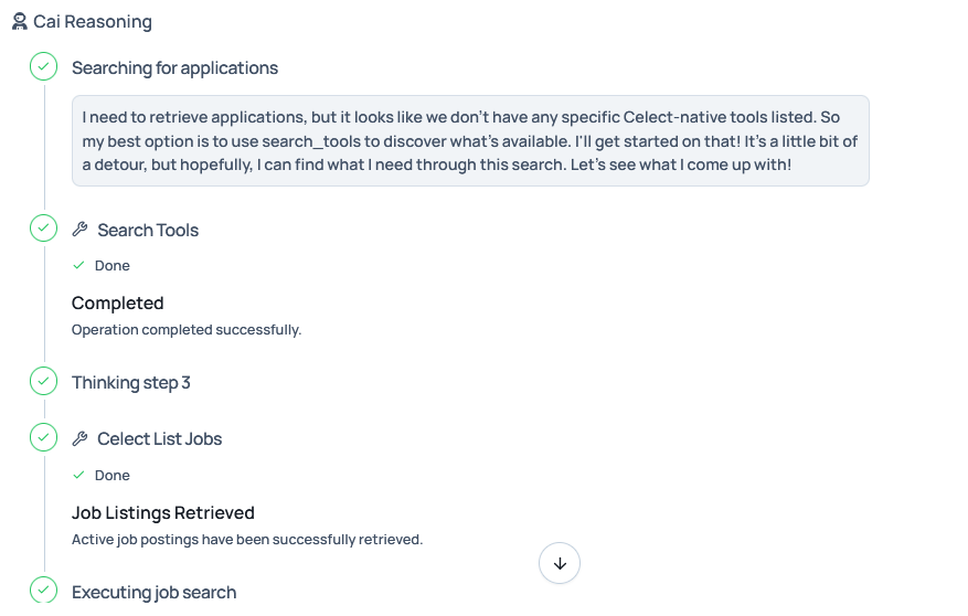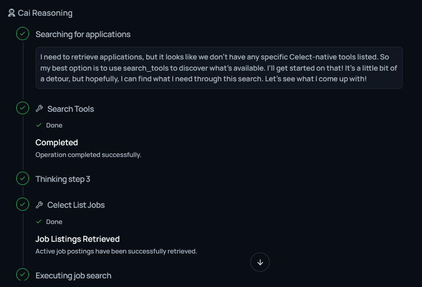 Any actions that Cai takes such as exploring your working workflow will be shown along as the reasoning of the agent