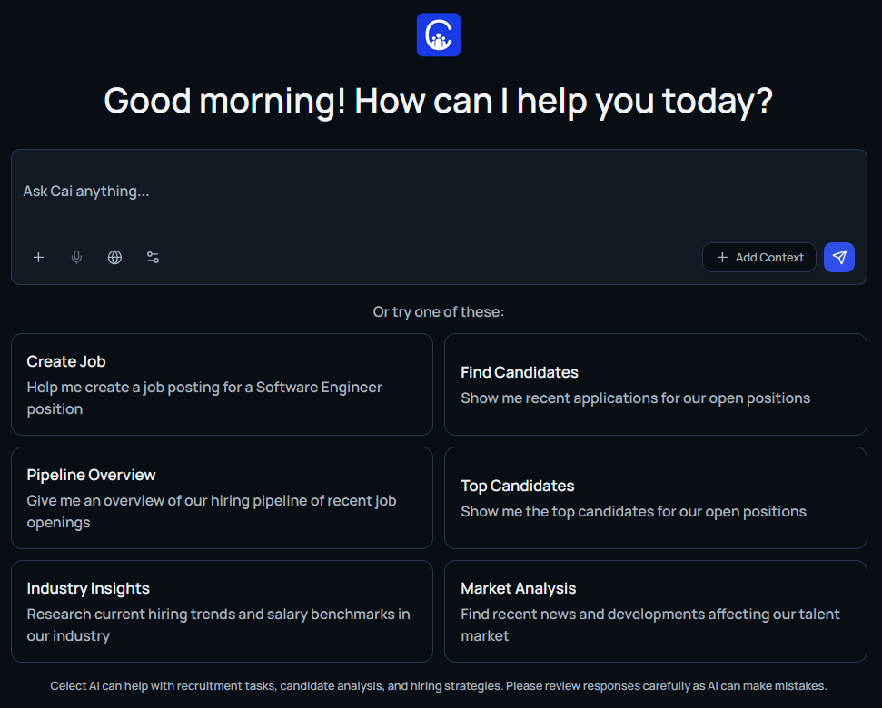 Cai is Celect’s semi-autonomous hiring agent. Type or speak natural language prompts and Cai will create jobs, manage applicants, schedule interviews, or surface insights in seconds. It connects to every major workspace surface—from job posts and pipelines to email, calendars, and candidate records.