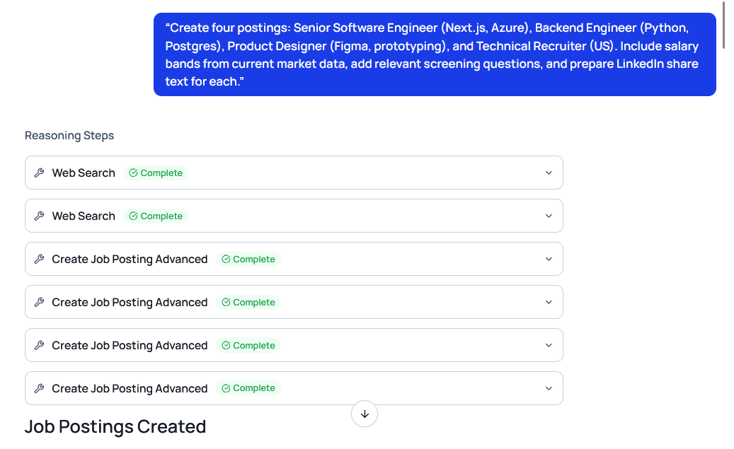 Result: Multiple market-calibrated job posts drafted and published in minutes.