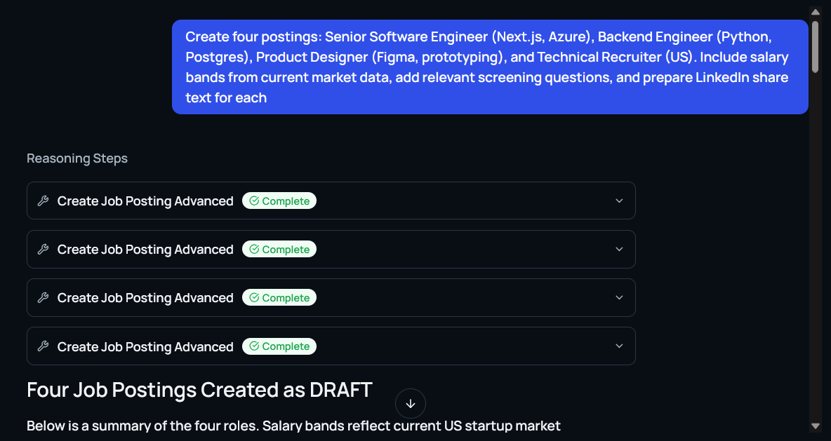 Prompt: “Create four postings: Senior Software Engineer (Next.js, Azure), Backend Engineer (Python, Postgres), Product Designer (Figma, prototyping), and Technical Recruiter (US). Include salary bands from current market data, add relevant screening questions, and prepare LinkedIn share text for each.”