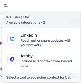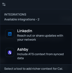 Integrations: Integrate other software so that Cai can connect and fetch or act on your data.