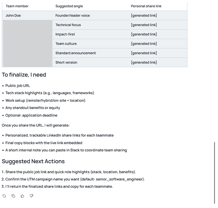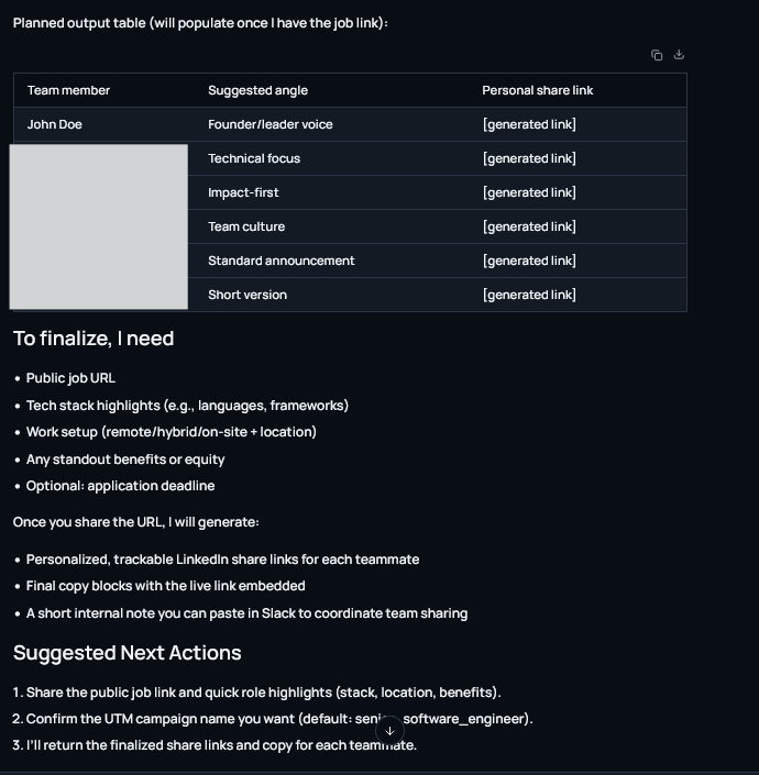 Prompt: “Write LinkedIn share text for our new Senior Software Engineer role and prepare team share links.”
